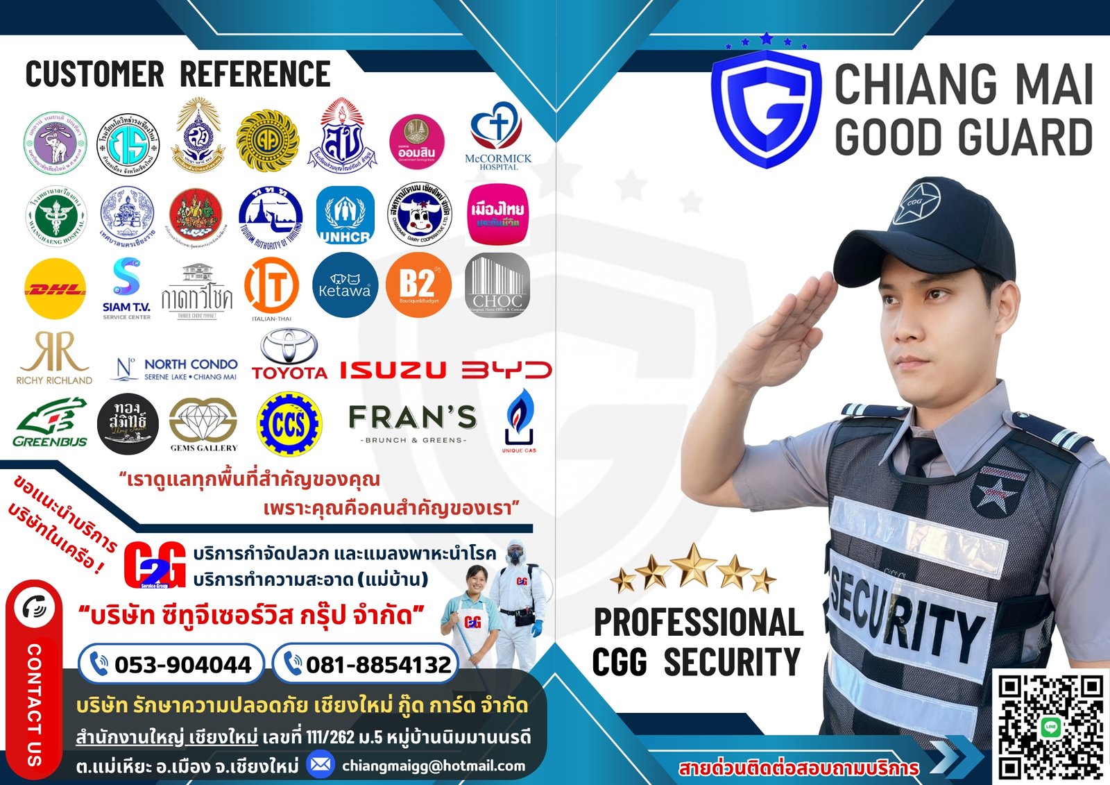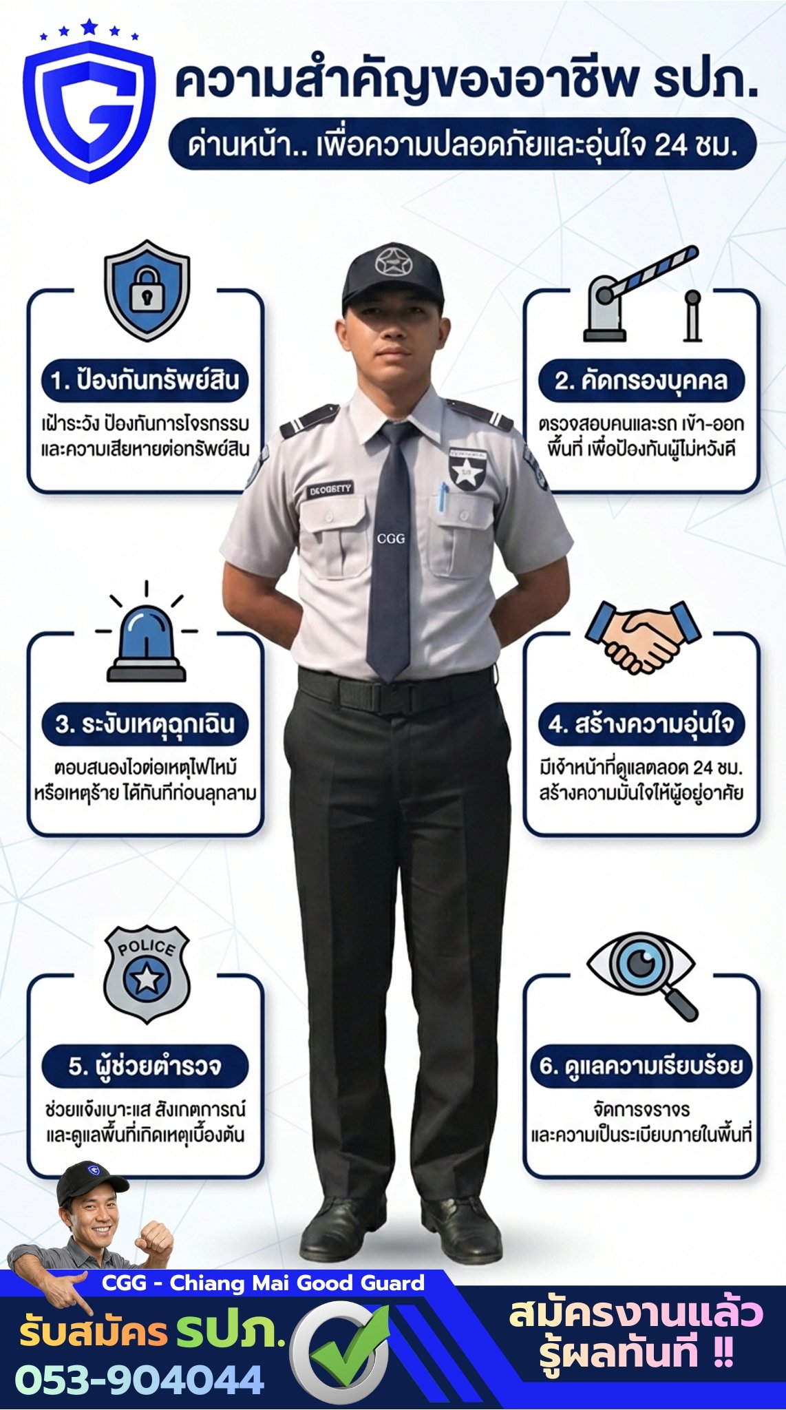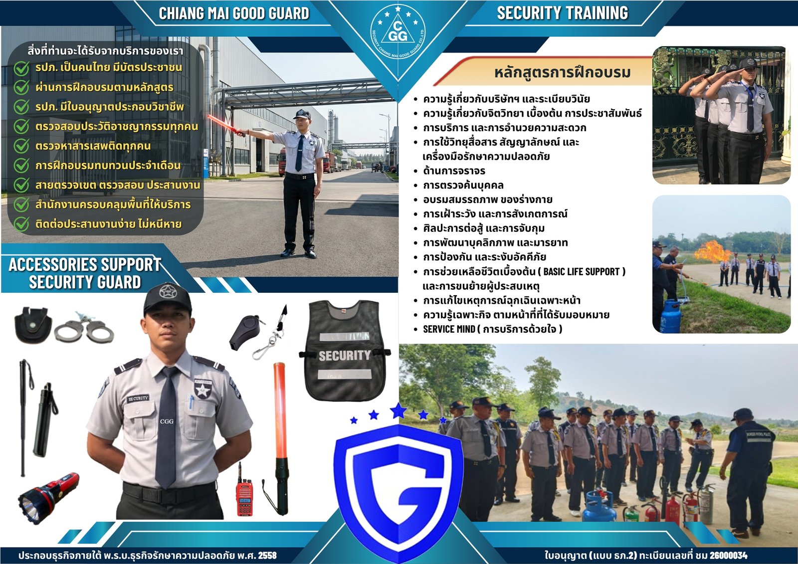 CGG – Chiang Mai Good Guard ให้บริการพนักงานรักษาความปลอดภัยที่ผ่านการฝึกอบรม มีมาตรฐานการทำงานชัดเจน และพร้อมดูแลพื้นที่ของคุณอย่างครบวงจร